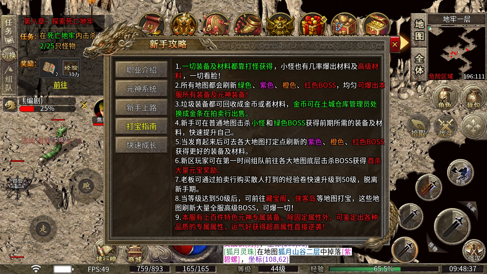 新手可以在普通地图里击杀小怪和绿色BOSS,以此获取前期需要的装备与材料,从而快速提升自身实力。