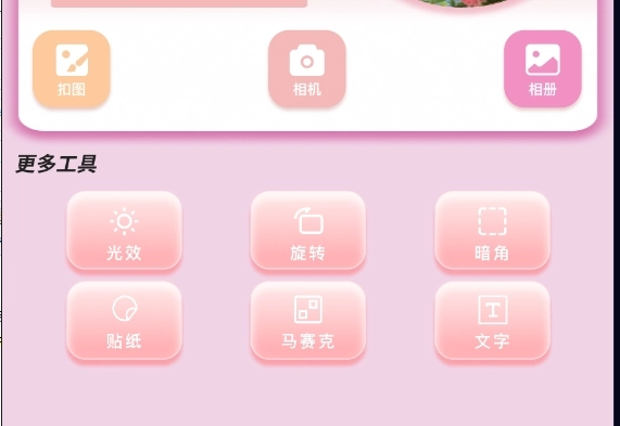 2. 提供光效、旋转、暗角、贴纸等功能,修图编辑素材丰富,还支持壁纸搜索。