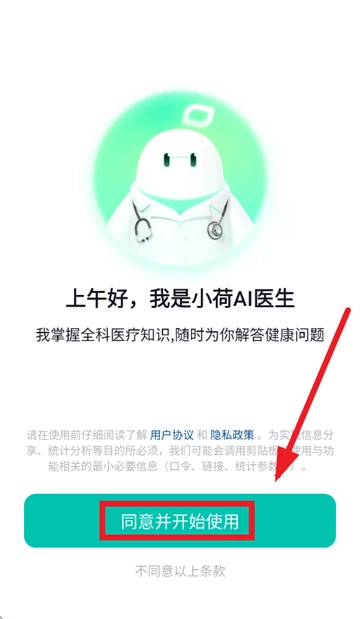 下载安装并打开小荷AI医生app,在用户协议和隐私政策提示界面点击同意并开始使用