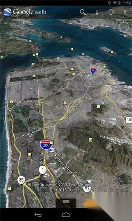 5、把镜头从外太空逐渐拉近至街景视图,便能查看以3D形式呈现的建筑、桥梁与树木,还可查找地点、规划行车路线以及获取更多内容。