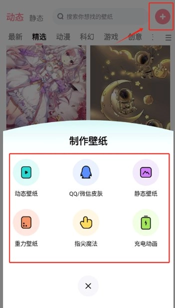打开应用后,先进入主界面,接着找到界面右上方的加号图标并点击,随后在弹出的选项中挑选你想要创建的壁纸款式。