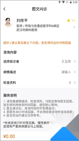 完善病情资料:选定医生后进入咨询界面,接着选择就诊人、填写病情描述并上传检查资料,之后点击“立即咨询”即可。