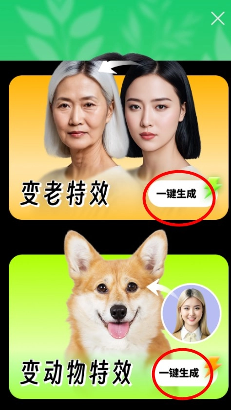 这款应用主要具备“变老特效”与“变动物特效”两大功能。用户选定心仪的特效后,点击“一键生成”按钮即可。