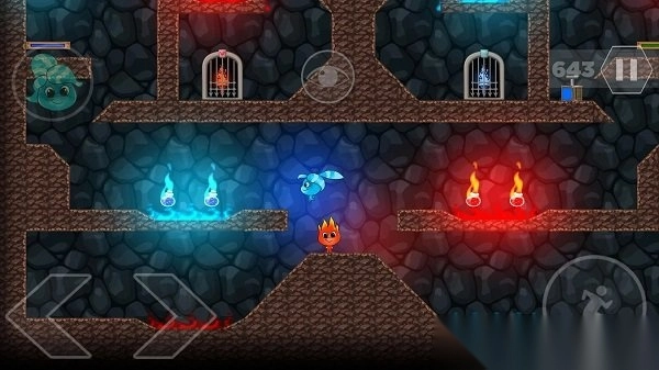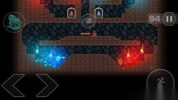 2. 冰人能在水面行走并冻结水流制造平台,火人可以融化冰块并点燃火炬触发机关。
