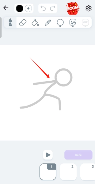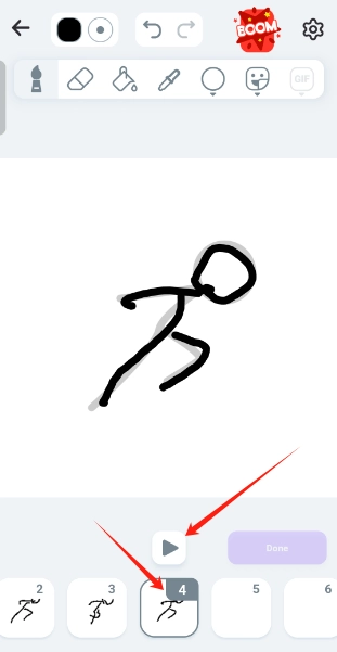 3、每完成一个动作步骤的绘制后,点击播放按钮以预览火柴人动画效果。