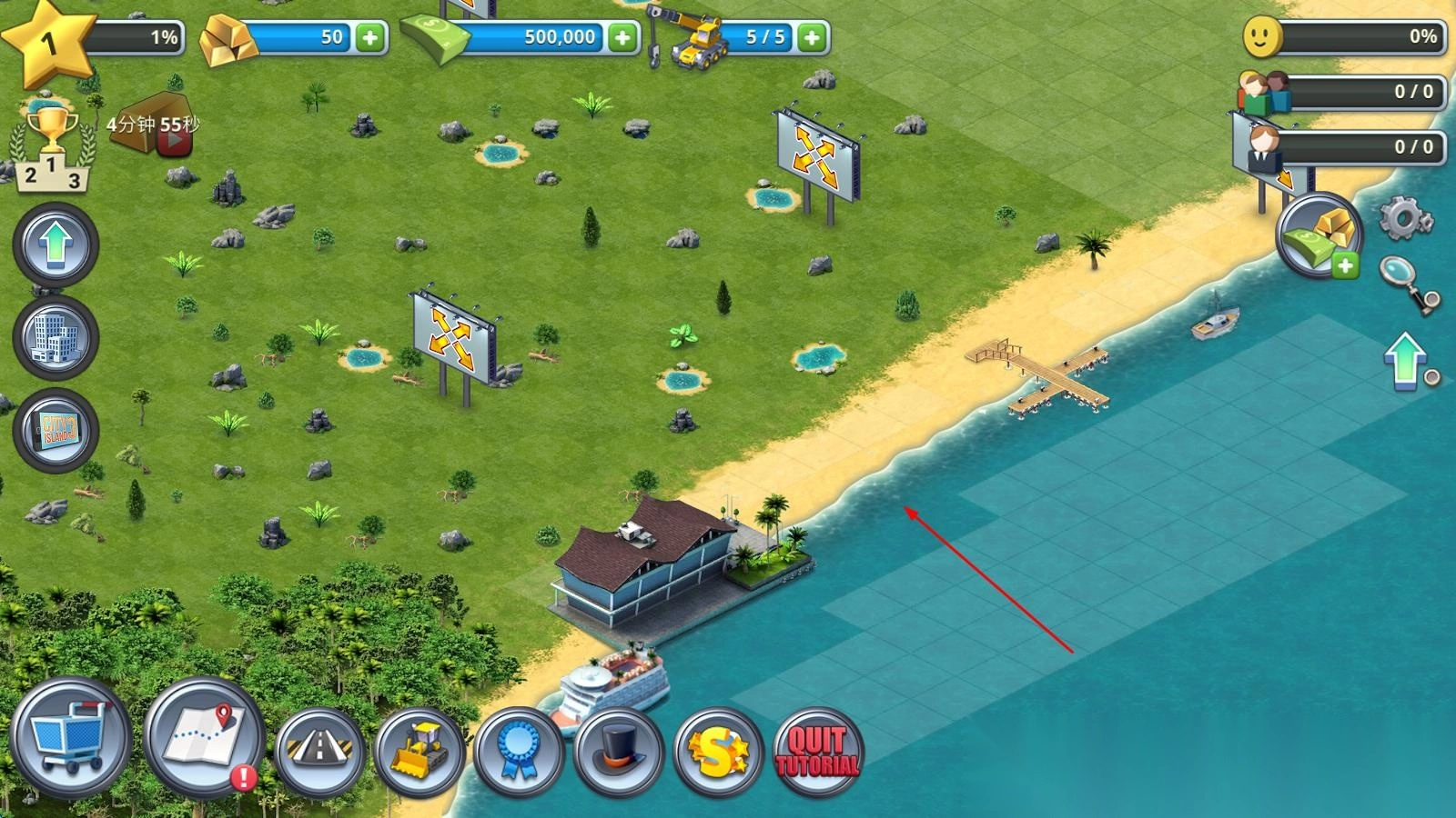 1. 刚进入游戏,起始于首个岛屿的村庄,通过建造基础住宅来吸引居民,搭建商业建筑以获取盈利,进而逐步解锁更多的基础设施。