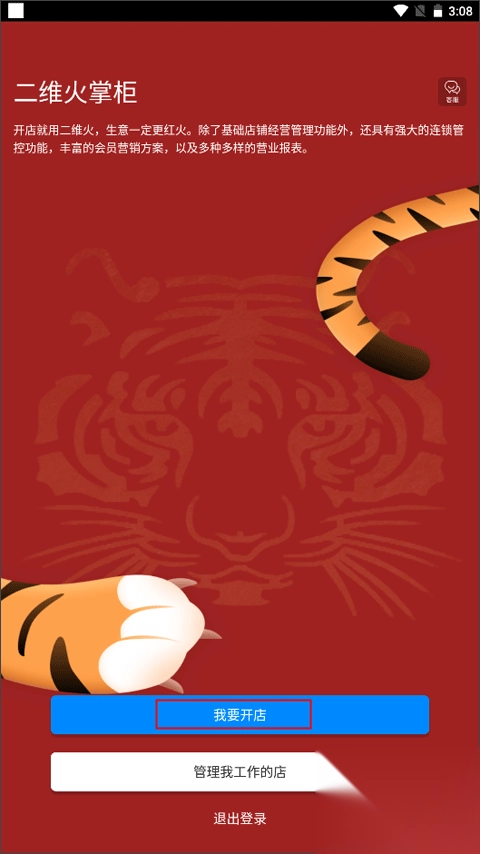 1、进入到app后,会显示两个功能选项:我要开店、管理我工作的店,选择第一个;