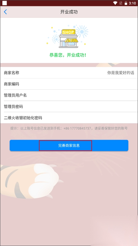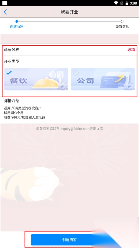 2、填写你的店铺名称、开业类型,点击下方的“创建商家”按钮;