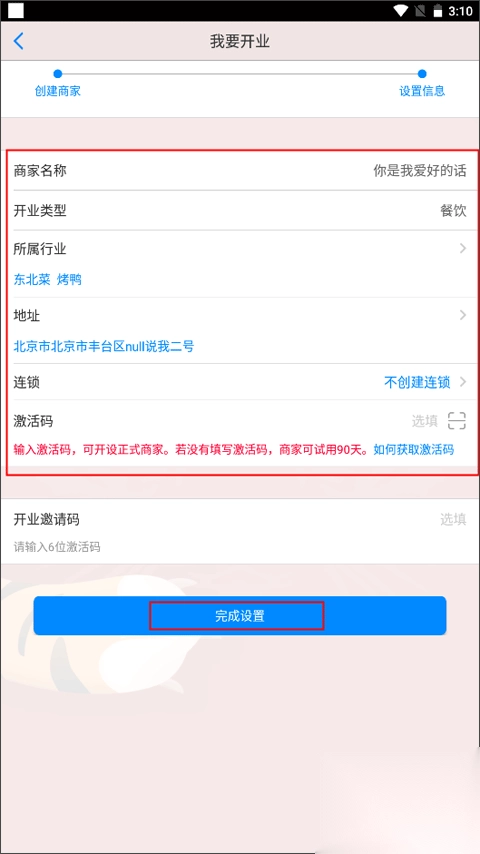3、接下来需填写店铺详细信息,包括所属行业、具体地址,选择是否连锁等,完成后点击“完成设置”,店铺就能创建成功。