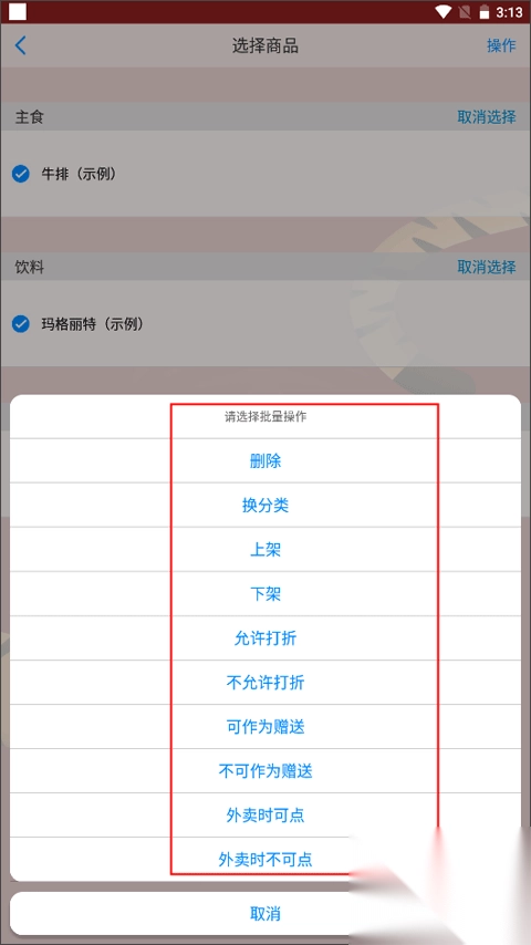 3、页面下方弹出了一系列批量操作的下拉菜单。若你想要添加商品,就需选择上架操作,使商品在app主页面展示出来。