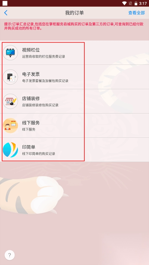 2、在此界面中选择“我的订单”,“我的订单”主要包含视频栏位、电子发票、店铺装修、线下服务、印简单等几个模块。