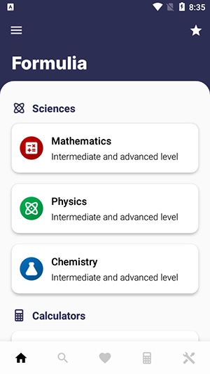 Formulia是一款针对理科学生,尤其是工程专业学生设计的应用程序。它旨在汇集数学、物理和化学不同分支的公式,并提供各类在进行特定计算时能起到辅助作用的其他工具。