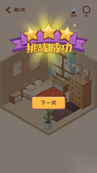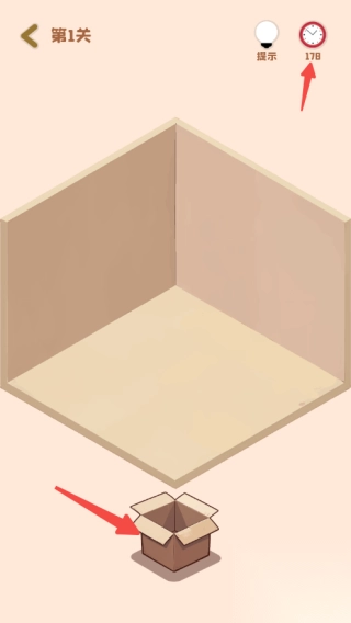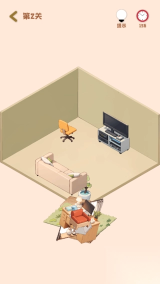 2、玩家需要点击纸箱获取家具,在规定的时间内摆放完成,当遇到困难时,点击提示获取提示;