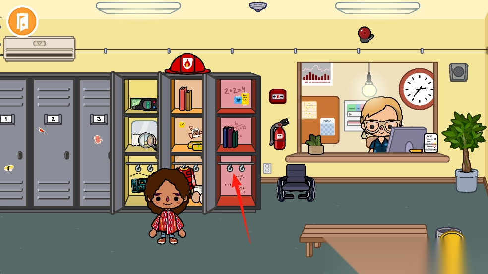 2. 在办公室场景中,操控角色(以红箭头指示)对储物柜进行翻找,收集物品(如书籍、工具等),并与NPC展开互动。