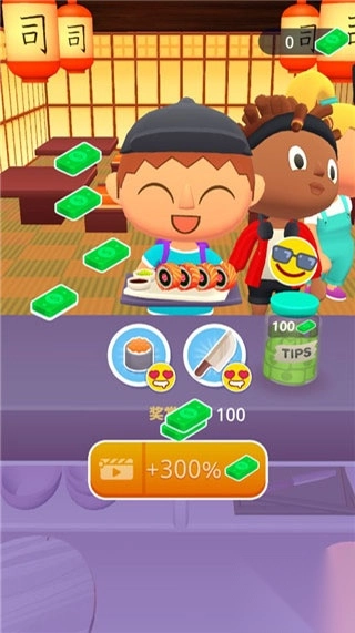 4、制作完成送上美味寿司可获得奖励,点击笑脸表情包还可获得额外奖励;