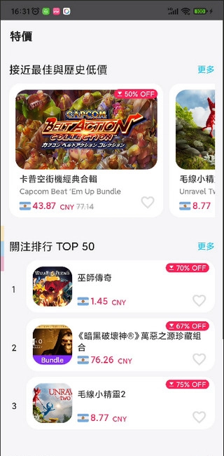 7、在首页也就是特价版块,可以看到目前最受关注的折扣游戏TOP50,基本都是非常便宜而且有一定知名度的游戏,一两块钱到十几块钱的都有性价比很高。