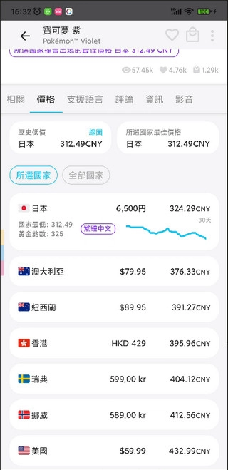 5、点击某款游戏,可以看到相关的所有商品,所有地区价格和支持的语言,以及评论资讯等等。