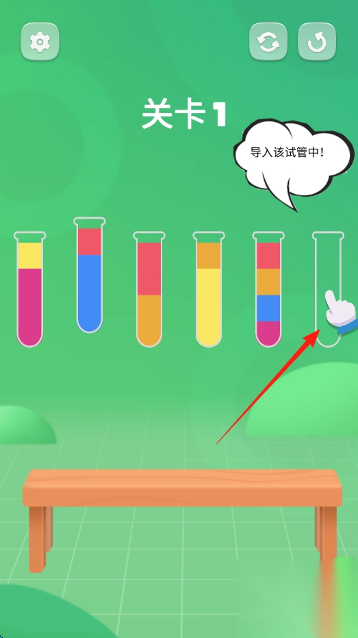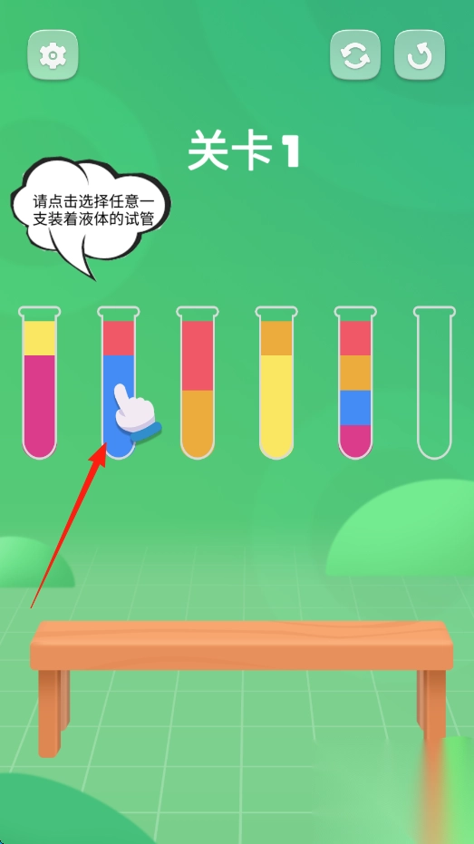 1、进入关卡1,点击装有液体的试管,按提示将液体导入指定空试管。