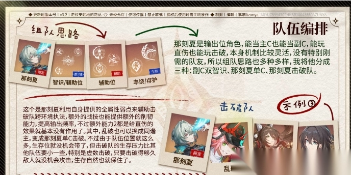 1. 组队思路:以那刻夏作为核心角色,搭配乱破、忘归人以及阮梅。凭借那刻夏全属性弱点辅助的能力,外加其额外战技能够提供控制效果,从而压缩敌人的行动空间,使其适配击破体系。