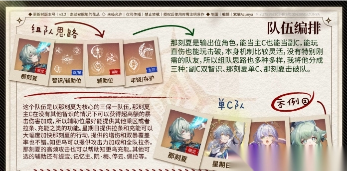 1、组队思路:那刻夏单核主C,搭配星期日(聚怪)、知更鸟(增伤)、藿藿(治疗);无其他智识角色时,借聚怪机制放大其爆伤收益。