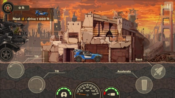 《战车撞僵尸3》中文版同样采用闯关玩法,每一关的长度相当可观。为此,游戏贴心地在每关中设置了三个记录点,这一设计十分良心。要是不想重新开始,就得争分夺秒向下一个记录点进发。当成功通过这三个记录点,就能开启下一关。游戏操作十分简便,屏幕左边控制车头和车尾翘起,中间设有仪表盘和油量显示,时刻留意油量,才能行驶得更远。右边则是类似油门的加速按钮,基本上需要一直按住,否则在规定时间内未抵达目的地,这局游戏就宣告结束。
