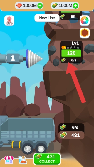 1该内容呈现了钻头、矿石、卡车等元素,其中矿石等级为Lv1 ,产量为120,每秒产出6个,可收集资源量为431 。这是一款模拟挖矿经营类内容,玩家能够通过升级设备开采矿石来获取收益。