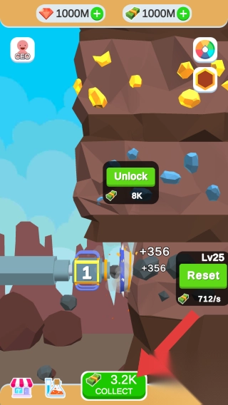 3、有钻头、矿石、“Unlock(解锁,需8K资源)”“Reset(重置,等级Lv25)”等元素,下方“3.2KCOLLECT”是可收集收益,呈现开采、升级、收益收集等经营玩法。