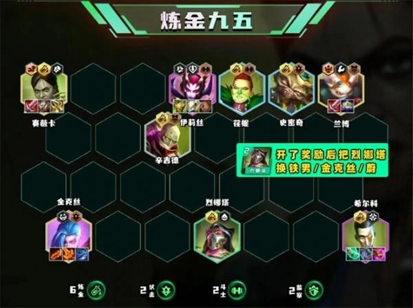 1、这套阵容六炼金即可,后期拿到奖励可以把炼金烈娜塔卖掉换铁男或者金克斯。