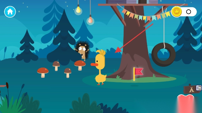 3、操控黄色鸭子角色,在树屋森林场景中自由移动,与环境元素(如蘑菇、刺猬、树屋)交互,推进探索任务或剧情进程。