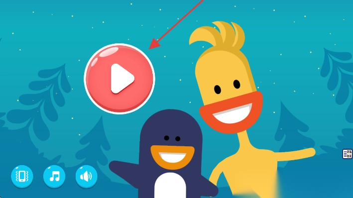 2、进入角色互动界面(黄色鸭子与紫色企鹅形象),点击中间红色播放按钮,触发游戏内的动画、关卡或互动模式。