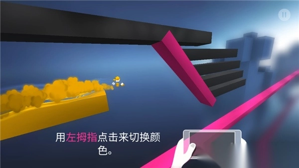 游戏中运行的平台将分为红色和黄色两种,玩家需要让角色在平台上变成什么颜色,否则会在瞬间被压碎,所以玩家需要在正确的时间点击左边的屏幕,使角色变成另一种颜色。