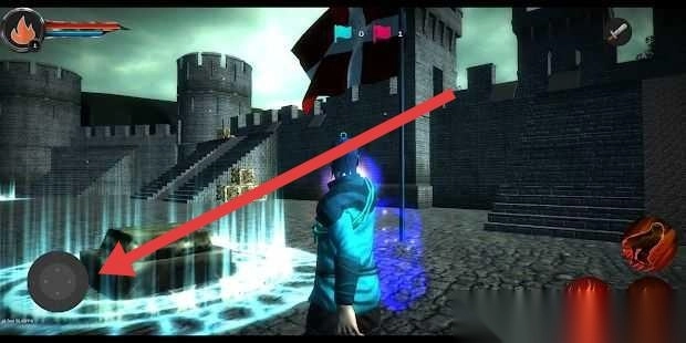 3、战斗场景,拖动左侧虚拟摇杆,操控角色移动,靠近城堡区域,准备触发战斗或探索任务。