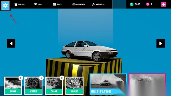 2、挑选一辆心仪的汽车,在界面左下角能够对汽车的油烟、轮子、颜色、引擎等进行更换。