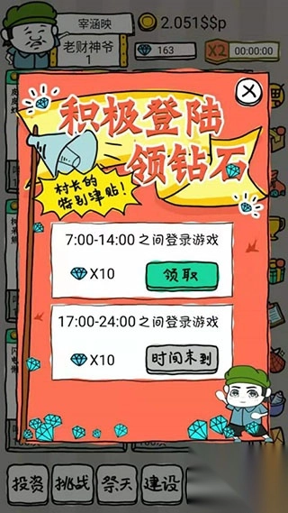 村长头像最右边有个X2小图标,还有一个倒计时。经常去点一点,可以进行一些小任务,获得限时翻倍的效果!倒计时代表可以X2的时间,尽量保持自己处在翻倍状态!