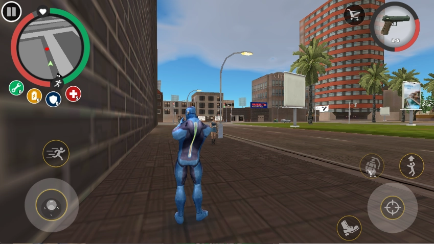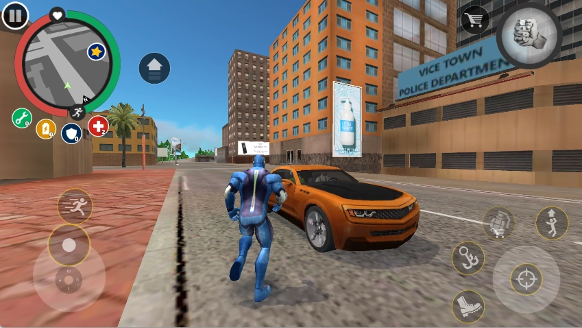 1游戏界面划分为左右两个操作区域:左侧由上至下依次排列着地图查看、奔跑切换以及角色移动按钮;右侧自上往下则依次展示角色能量条、血量值、上车(在特定条件下才会出现)、跳跃、绳索发射、攻击和脚踢操作。通过手指在屏幕上滑动,玩家能够自由控制视角,进而提升操作的流畅度。