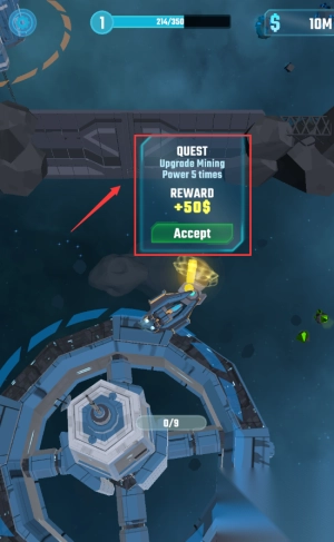 3、领取采矿升级任务,花费10M金币,使能量值提升至214/350 。