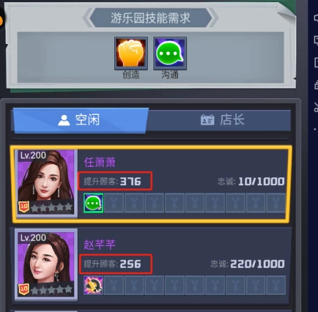 当然光上任人才还不够,细心的董事长可能会发现,不同建筑需求的技能不一样,是的,当上任的人才技能与建筑需求的技能相同时将会额外提高建筑的提升顾客数。