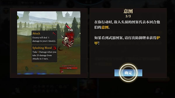 3、当你采取行动时,敌人头顶所显示的图案表明了他们本回合的意图。要是看到武器图案,就打出防御牌以获取护甲。