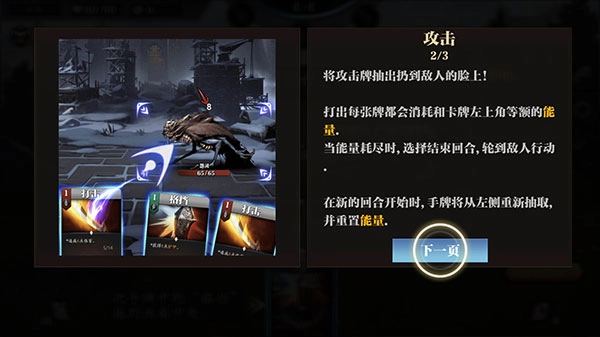 2、把攻击牌抽出来扔向敌人的脸!打出每张牌会消耗与卡牌左上角数值相等的能量。当能量用完后,选择结束本回合,接着轮到敌人行动。新回合开始时,手牌会从左侧重新抽取,同时能量也会重置。