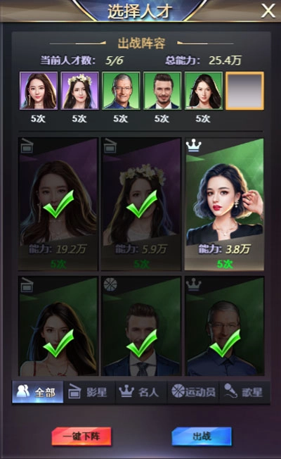 每个人才初始有5次出战次数,每小时会增加5次,每天最多15次。每次商战可出战人数最多为6人。