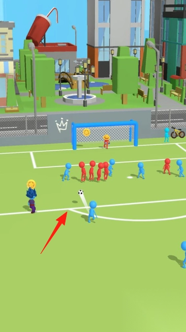 2、操作目标传球、射门,避开对手(红色火柴人),突破防线,将球踢入对方球门(不同造型门框)得分。