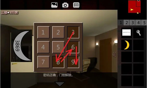 1. 在泞之翼2迷失的开场剧情结束以后,玩家能够获取【奇怪的纸条】,纸条上面写着“2044年4月4日”。接着点击白色门,走进卫生间,拿走【银质小钥匙】。再点击右边窗户(黑色箭头所指向的位置),使用【银质小钥匙】打开窗户并翻窗出去。随后进入3F•303房。往后退3次,拿走月亮形状的【积木】。仔细观察【积木】,会得到一组4位密码(密码是随机的)。退回来,点击密码器,输入从【积木】上获取的4位密码,解开房门的锁,然后出门,进入3F•西侧廊。