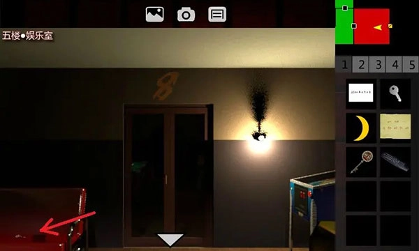 5、回到一楼的电梯间。按下5楼按钮,出电梯后进入五楼的西侧走廊。连续左转三次,打开红色1号门,进入五楼的“生命之歌”区域。此时触发剧情。往后退,拿走放在桌子上的【遥控器】,接着出门回到五楼的西侧走廊。点击密码器,需要输入5位密码。由retaw联想到相关内容后,门锁解除,进入五楼的娱乐室。取走【3号钥匙】,再次触发剧情。之后丹回到五楼的西侧走廊。