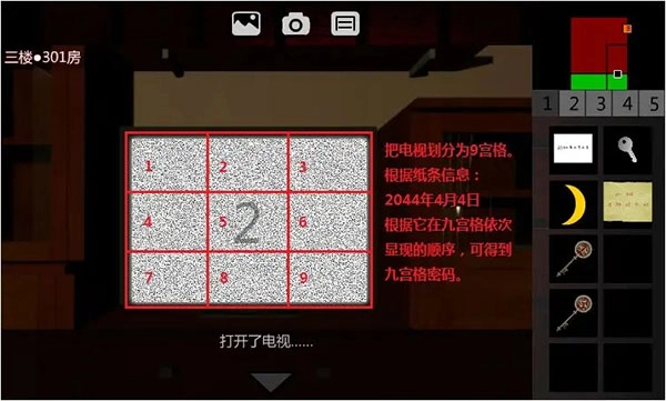 6、返回3F·301房间,向右转,使用【遥控器】打开电视。(将遥控器拖到电视上)可以观察到纸条上“2044年4月4日”这串信息,会按顺序在不同位置逐一显现,这或许暗示着密码。将电视看作9宫格,记录下信息显现的顺序,该顺序固定为591274638 。