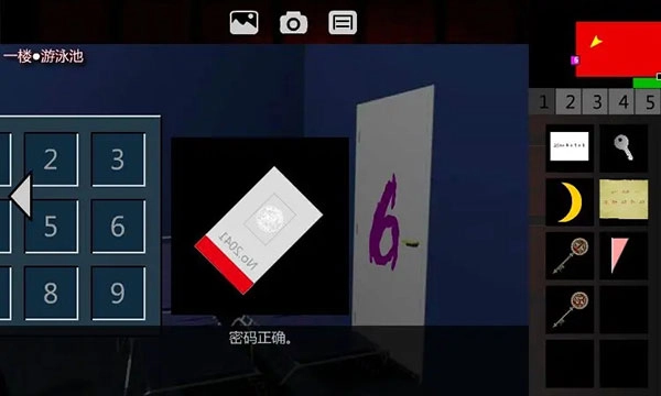 8、打开密码器,走进1F•厨房。向右转两次,点击窗户,从窗户翻出去,进入1F•游泳池。接着右转,点击密码器,该密码器为九宫格样式,很容易让人联想到电视机上文字的出现顺序。输入固定密码591274638 ,拿走【临时门禁卡】。随后返回1F•电梯间。