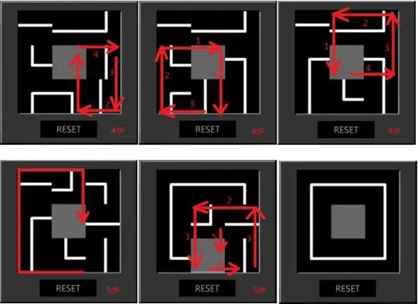 11、出门后,来到5F•北侧廊。向左转,接着上楼,此时会触发剧情。随后连续左转3次,就能看到铁门左边的密码器。其原理是进行三阶拼图,需将拼图拼成白色的“口”字形。拼好后再点击一下,便会打开,这时刷【临时门禁卡】,即可进入铁门。具体解法为:完成每一部分拼图时,要确保你面前的拼图与下一部分是重合的。