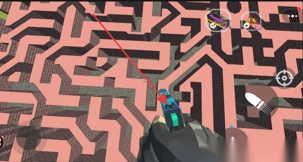 3、面对迷宫围墙,按红色指引,点击武器图标射击,打破障碍,继续探索。