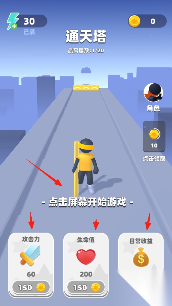 1. 前期准备:在通天塔界面,能够通过消耗金币来提升攻击力、生命值以及日常收益等属性。完成属性提升后,点击屏幕开始游戏,从而进入关卡。