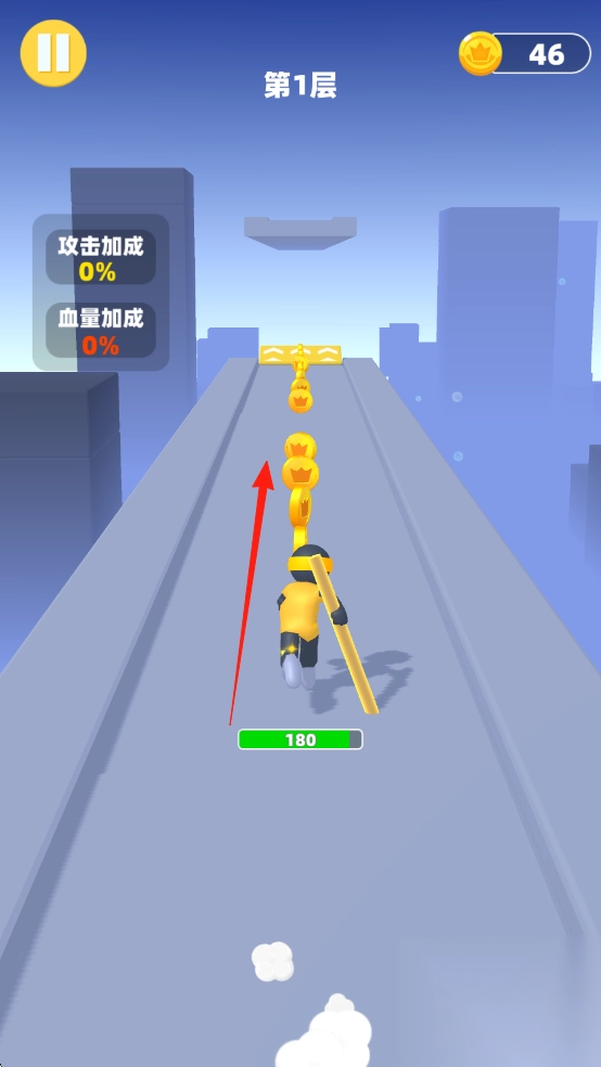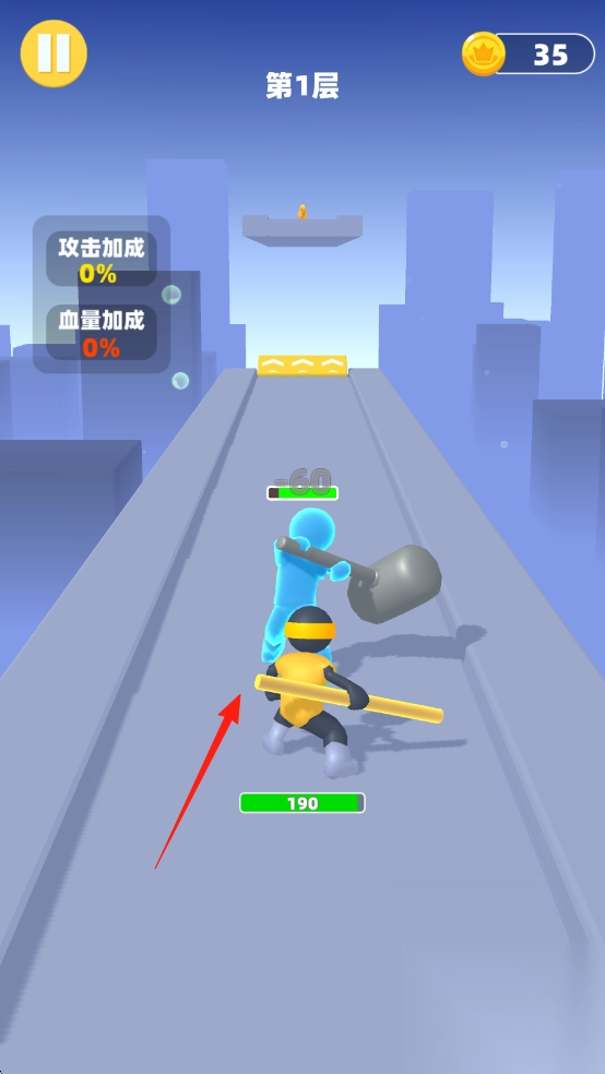 2、战斗推进在第1层,操控黄色角色(持长棍),攻击蓝色敌人(持巨锤),击败后沿箭头指引,收集金币,向高层推进。