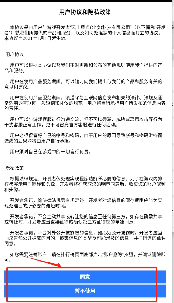 1、游戏协议页面,顶部有用户协议和隐私政策标题。看完后点红色框住的同意按钮,箭头指着它,旁边还有个暂不使用按钮。